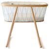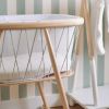 Die Wiege Kumi von Charlie Crane vereint auf harmonische Weise Tradition und Moderne. Ihre schlichte Form und die natuerliche seitliche Schaukelbewegung helfen Neugeborenen sanft beim Einschlafen, waehrend der moderne Akzent durch den transparenten Mesh Stoff und die grafischen Kreuzschnuerungen aus Seil gesetzt wird. So fuehlen sich die Kleinsten in einem beruhigenden Kokon geborgen und behalten gleichzeitig den Blick auf ihre Umgebung. Bitte beachten Sie, dass die Baender beim Aufbau von den Eltern selbst eingefaedelt werden, ein symbolischer Moment, der es ermoeglicht, aktiv am Aufbau des ersten Nestes fuer das Baby teilzunehmen. Die Wiege wird mit Matratze geliefert, und zusaetzliche Accessoires sind optional erhaeltlich, um das Set zu ergaenzen.