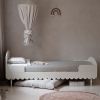 We love the Babushka collection by Wood Luck Design, with its romantic and delightfully vintage style! We adore its refined details and scalloped edge, which give it a uniquely charming touch. Made of beech wood and MDF, this 90 x 200 cm single bed is the perfect choice for a child or teenager. Its removable sides provide extra safety for younger children and can be taken off over time, accompanying your child as they grow. The bed comes with a flexible slatted base, ensuring optimal comfort and support. A matching mattress (90 x 200 cm) is available separately.