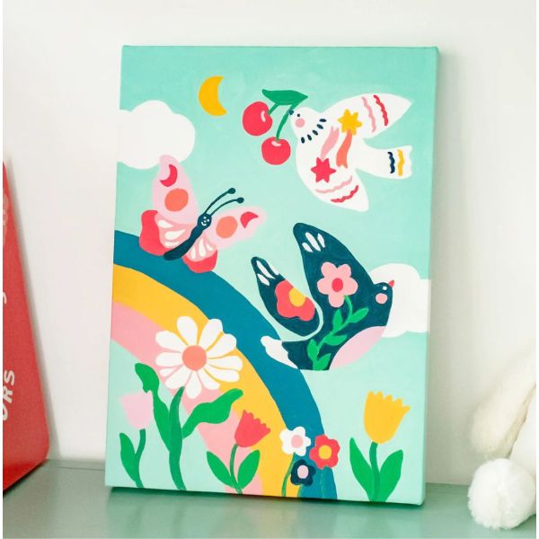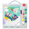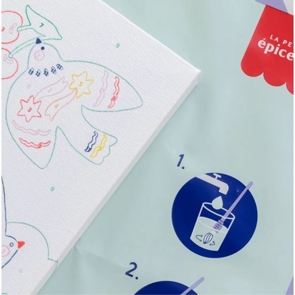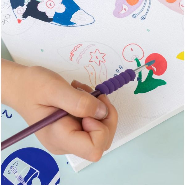 • Box contents: 1 ergonomic brush, 11 resealable water-based paint pots, 1 protective adhesive tablecloth, and 1 canvas (18 x 25 cm) to paint.
