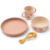 An adorable silicone tableware set for kids, both practical and fun! Children will love eating and drinking from their soft and flexible little dishes. The set includes: a plate, a bowl, a glass, and a spoon. All items in the set are made from silicone, a great alternative to plastic and porcelain, with the added benefit of being unbreakable!