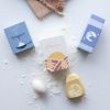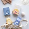 • Le set contient 5 aliments : une brique de lait, un paquet de sucre, un œuf, un sac de farine et un tube de miel, le tout rangé dans un charmant sac en crochet d’inspiration française.