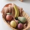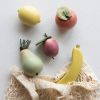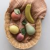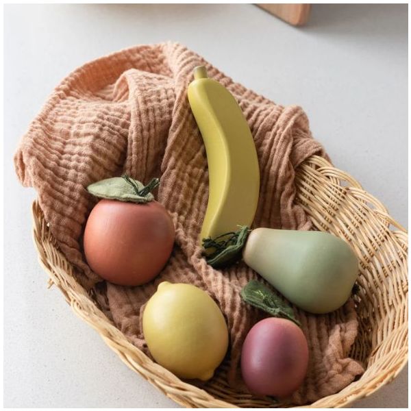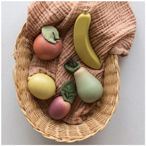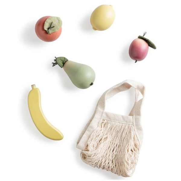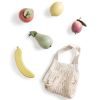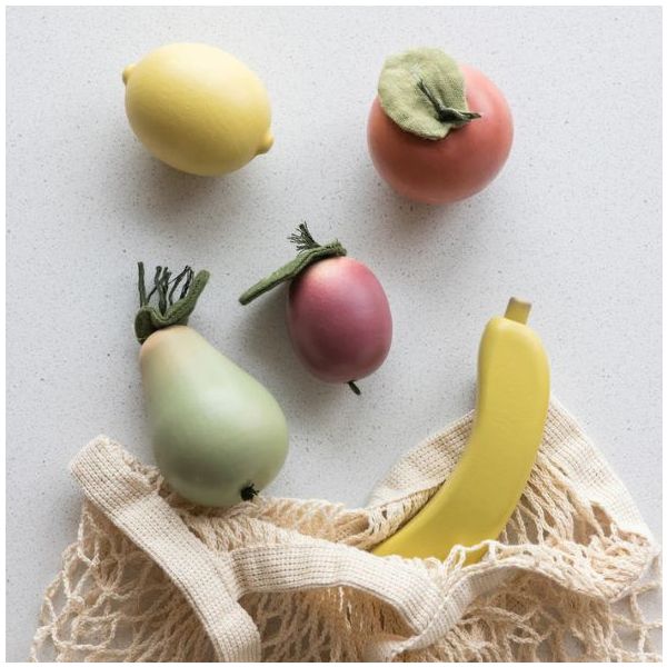 • Le set contient 5 fruits : une banane, une pomme, une poire, un citron et une prune, le tout rangé dans un charmant sac en crochet d’inspiration française.