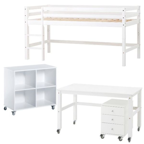 Voici un lit mi-hauteur Hoppekids avec bureau,caisson à tiroirs et bibliothèqye intégrés, parfait pour une chambre d’ado ! Ingénieux et fonctionnel, il permet de créer un véritable coin bureau, pratique et confortable pour travailler ou étudier. Le bureau, le caisson et la bibliothèque sont montés sur roulettes avec système de verrouillage, afin de pouvoir les déplacer facilement selon les besoins. Évolutif, le module mezzanine est amovible : le lit se transforme en lit banquette, qui pourra ensuite évoluer en lit mezzanine, lit cabane ou lit superposé grâce aux kits de conversion (vendus séparément). L'échelle peut être installée à gaucheou à droite. Fabriqué en pin massif et certifié Nordic Swan, ce lit garantit sécurité, durabilité et respect de l’environnement. Sa finition est réalisée avec une laque à base d’eau, sans substances nocives ni produits chimiques superflus. L’échelle peut être positionnée à droite ou à gauche pour s’adapter à toutes les configurations de chambre. Le lit est livré avec un sommier et un matelas aux dimensions adaptées (90 x 200 cm) est vendu séparément.