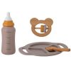 • Le set comprend un biberon, une assiette avec une cuillère et un hochet.