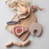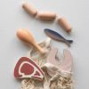 • Le set contient 5 aliments : un poulet, une darne de saumon, trois saucisses reliées par une ficelle, un poisson et un steak, le tout rangé dans un charmant sac en crochet d’inspiration française.
